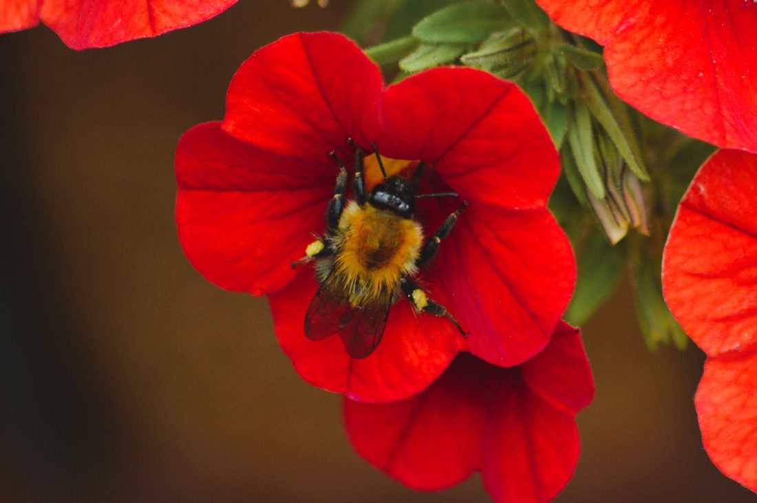 Description: A bumblebee nestles into a vivid red flower, immersed in its vital work of pollination. This close-up captures the intricate details of both bee and bloom, highlighting the delicate interdependence between species. It's a gentle reminder of the small wonders that sustain our natural world, often unnoticed but deeply important.