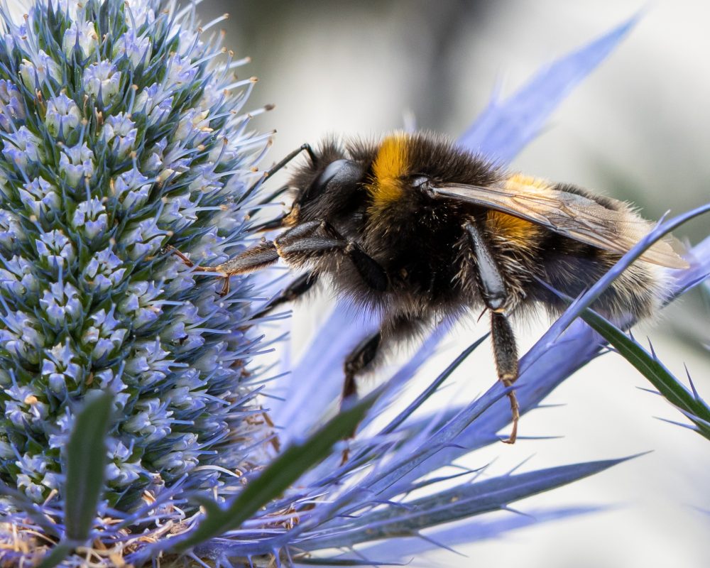 Description: The bees in my garden absolutely love the Eryngium. I worked out what plants I would need to attract pollinators and this was high on the list! The bee was moving around from flower head to flower head. I thought it was an interesting photo to show the bee moving