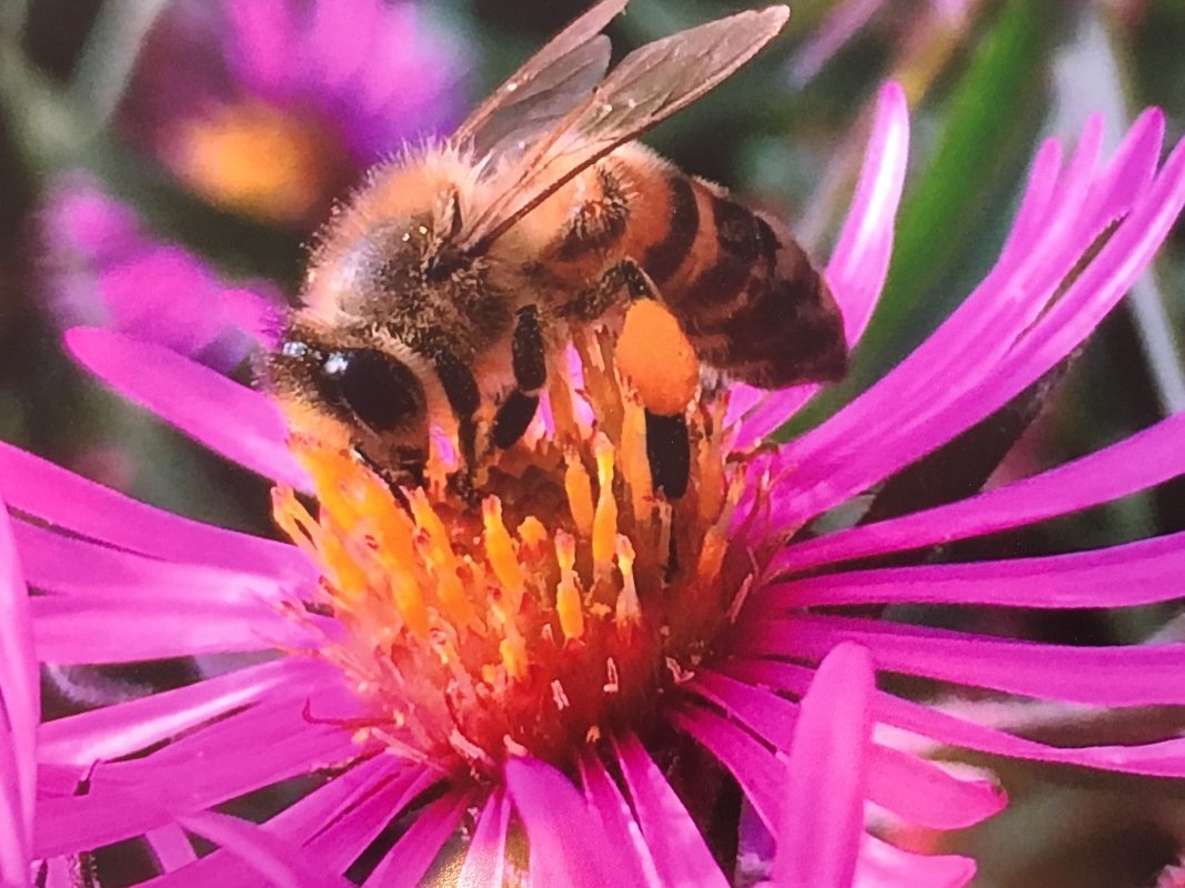 Title: Honey bee on Michaelmas Daisies