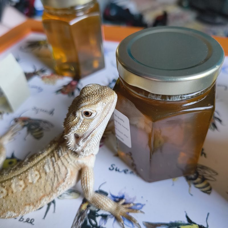 My Rankins dragon Dimples inspecting the honey